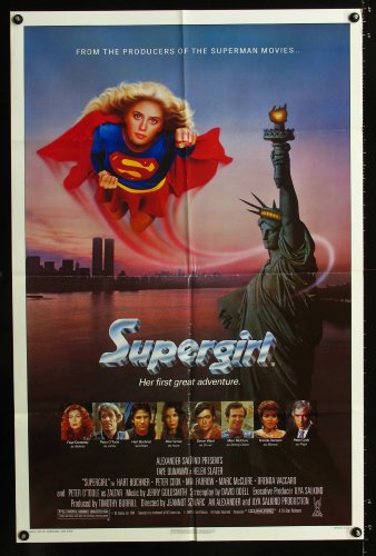Supergirl one-sheet movie poster '84 super Helen Slater in costume flying over Statue of Liberty!An Original Vintage Theatrical Folded One-Sheet Movie Poster (measures 27" x 41") Supergirl, the 1984 Jeannot Szwarc New York City English comic book superhero action fantasy adventure ("Adventure runs in the family"; "From the producers of the Superman movies..."; "Her first great adventure.") starring Faye Dunaway ("as Selena"), Peter O'Toole ("as Zaltar"), Hart Bochner ("as Ethan"), Mia Farrow ("as Alura"), Simon Ward ("as Zor-el"), Marc McClure ("as Jimmy Olsen"), Brenda Vaccaro ("as Bianca"), Peter Cook ("as Nigel"), Helen Slater (in the title role as Supergirl), and Maureen Teefy this poster has minor border and fold wear This is a VINTAGE movie poster made for use in theaters at the time of the film's original release. (*) This is NOT a reproduction, NOT a 'video poster', and is NOT an 'art print'! It is ORIGINAL! (*) This item is in very good to fine condition. (*) Folded. Know that until approximately 1990, almost all one-sheet movie posters were folded before being sent to theaters and this is how they were created and is NOT a defect. More details |